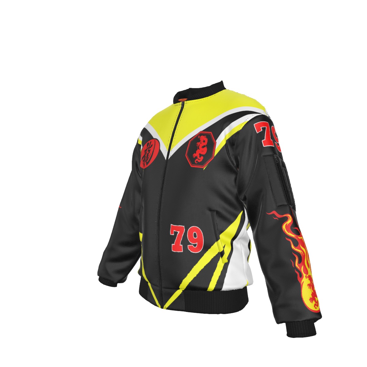• Black rib-knit,black zipper, pocket with black zipper on left sleeve