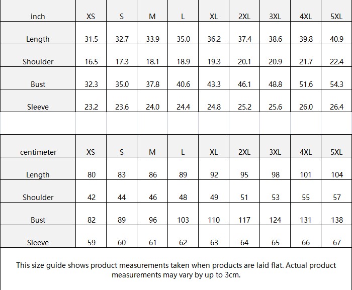 | centimeter | XS | S | M | L | XL | 2XL | 3XL | 4XL | 5XL |